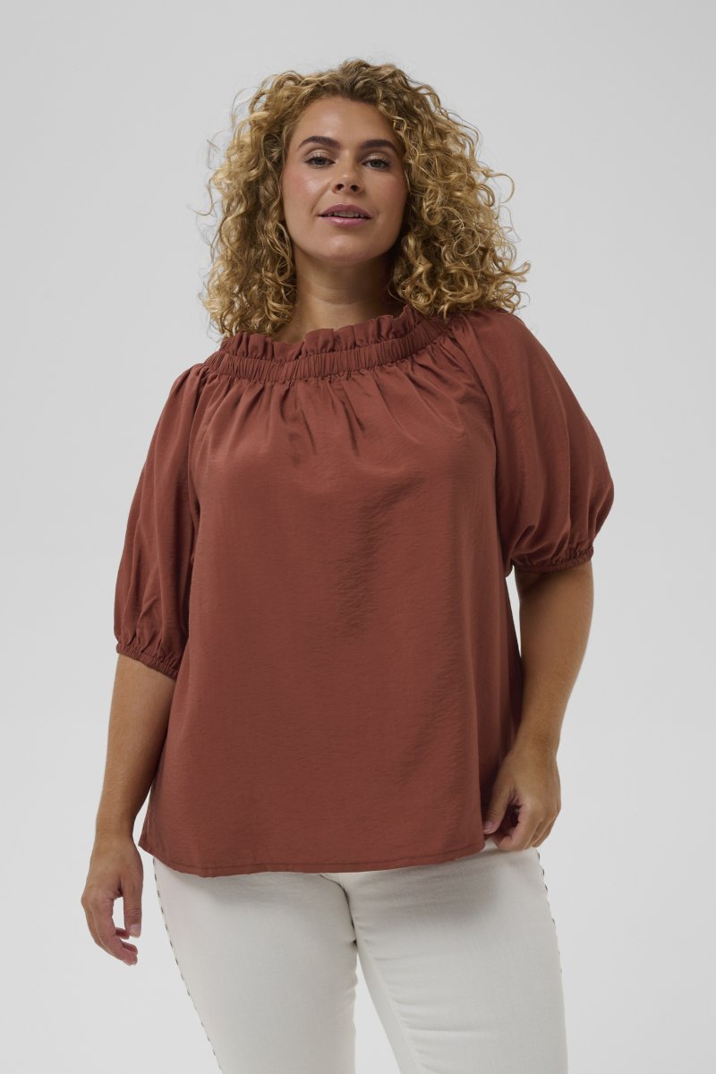 BluseTilgjengelig i størrelser 42–54Fra merket Kaffe CurveLaget av 87 % viskose (LENZING™ ECOVERO™) og 13 % nylonLøs passformFargen er brunKlikk her for å se størrelsesguiden