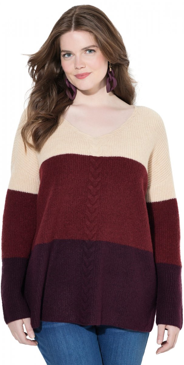 Størrelsesguide - Ulla Popken Cable Knit Block Stripe V-Neck Sweater Dark Ruby