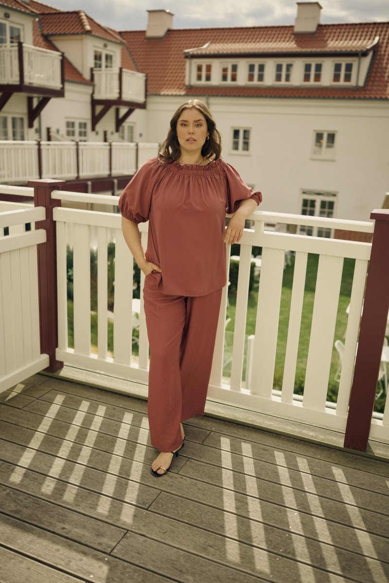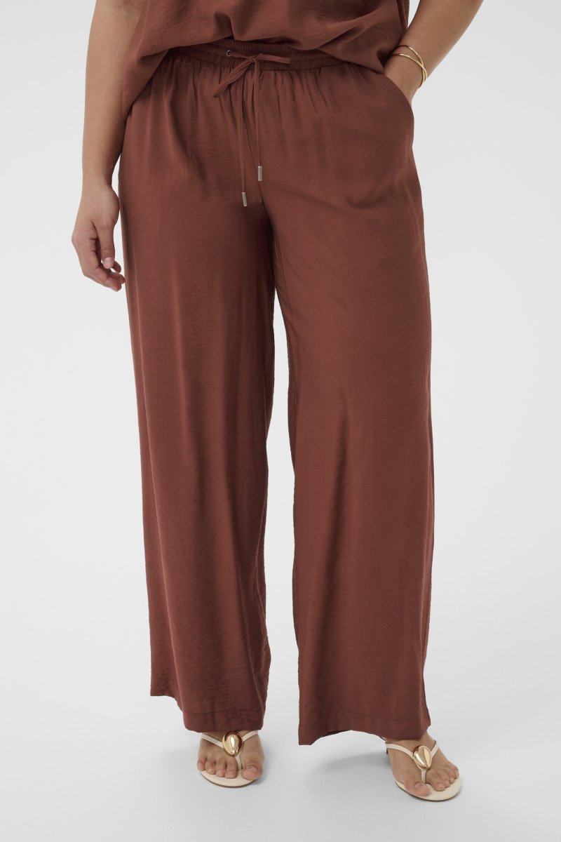 BukserTilgjengelig i størrelser 42–54Fra merket Kaffe CurveMateriale: 85 % viskose, 15 % polyamidLøs passformFargen er brunKlikk her for å se størrelsesguiden