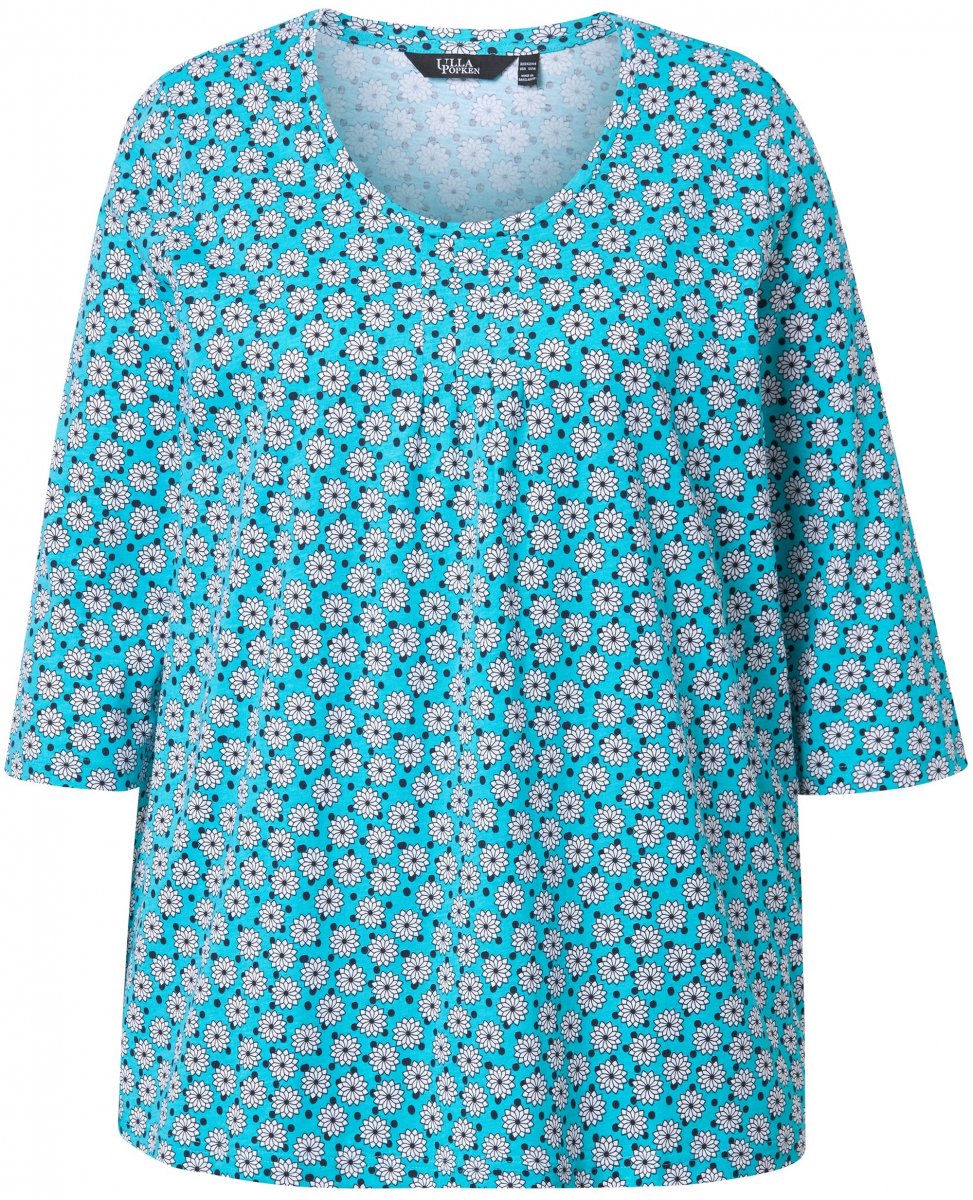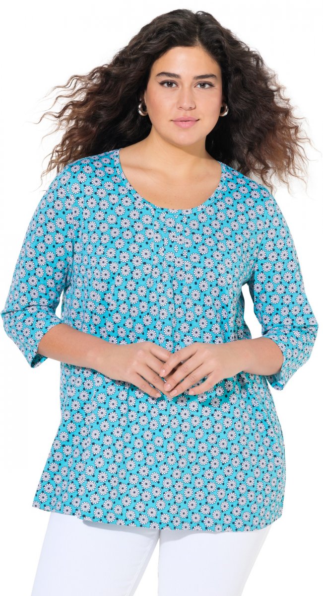 Ulla Popken Flower Print 3/4 Sleeve A-Line Tee Deep Aqua