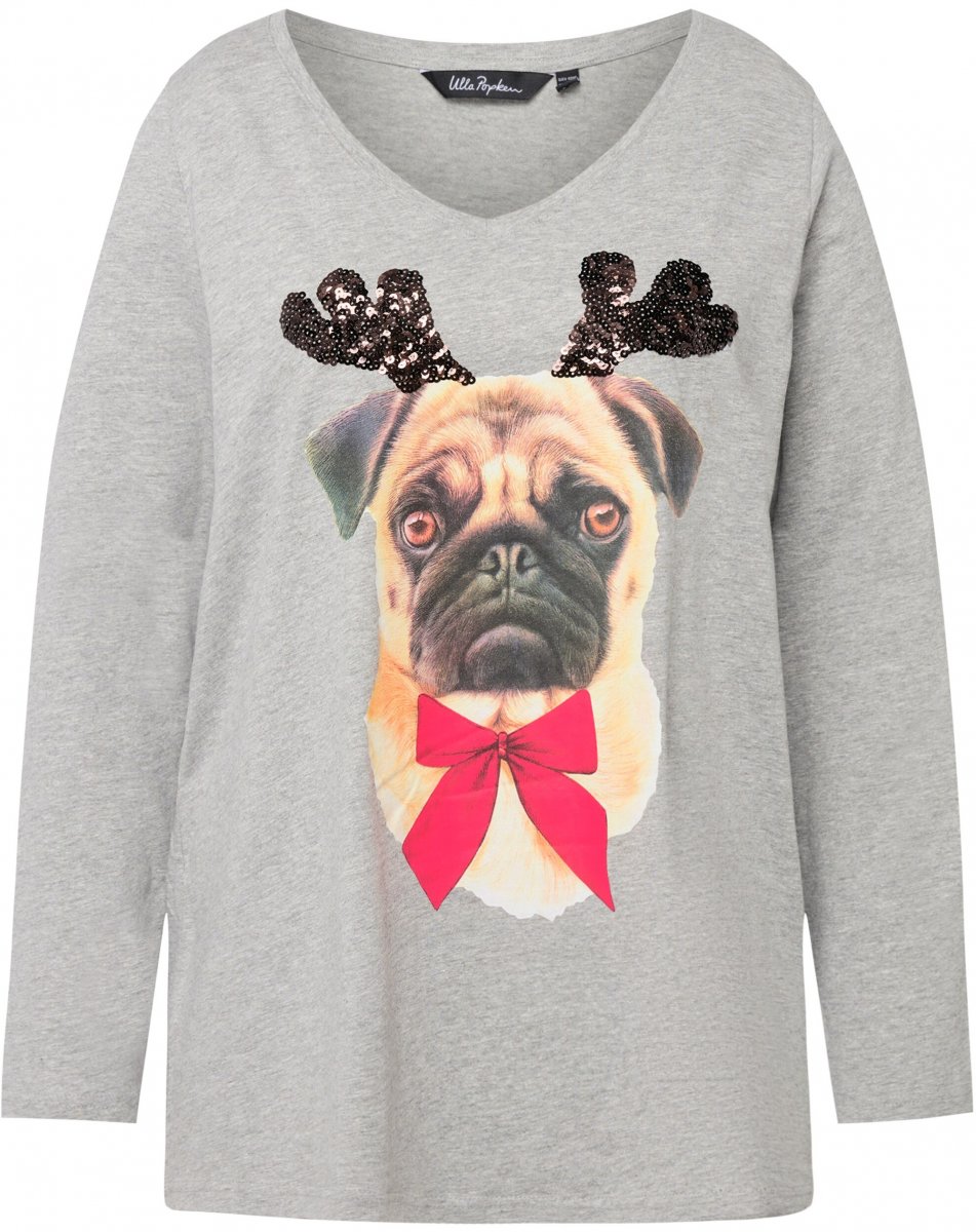 Ulla Popken Holiday Pup Sequin Accent A-line Fit Tee Light Grey Melange